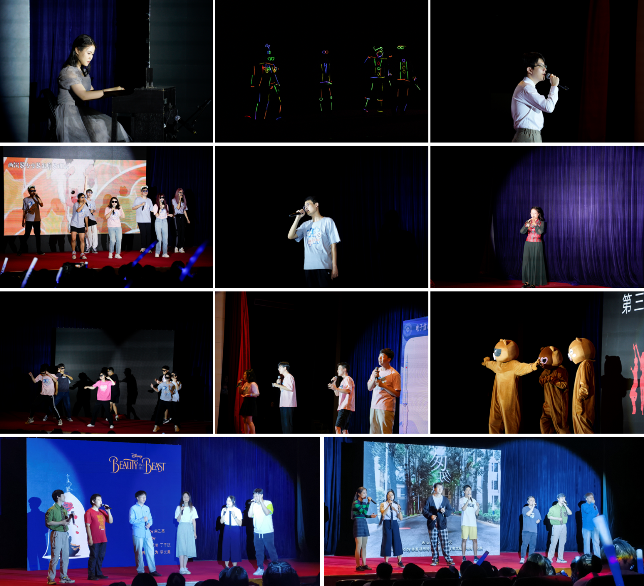 随着主持人刘莹同学一曲慷慨激昂的钢琴独奏《克罗地亚狂想曲》,大班同学们纷纷将自己的才艺展现的淋漓尽致。有欢快搞怪的舞蹈《荧光舞》、《无人谢幕》、《爱如火》,有深情婉转的个人独唱《残酷月光》、《多情应是我》,有充满回忆的大合唱《童年歌曲串烧》、《七里香》,有热情洋溢的唢呐独奏《好汉歌》,还有阿卡贝拉社友情献礼的清唱曲目《匆匆那年》、《Beauty and the Beast》。舞台上抑扬顿挫演唱声伴随着舞台下经久不息的欢呼声和掌声,将晚会的氛围逐渐推向高潮。
